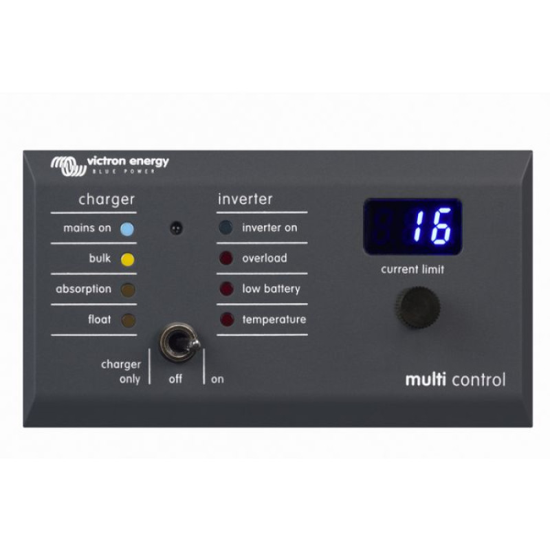 Acest panou este destinat atât pentru Multi-uri, cât și pentru Quattro-uri. Permite setarea limitei de curent PowerControl și PowerAssist pentru două surse de curent alternativ: un generator și curent la mal, de exemplu. Interval de setare: până la 200 Amperi. Luminozitatea LED-urilor este redusă automat în timpul nopții.